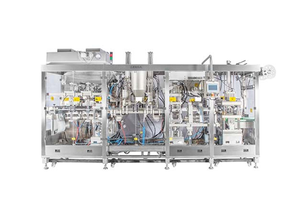 Horizontal automatic thermoforming machine for forming of package, filling the packages with product and sealing the filled packages with laminated aluminum foil.